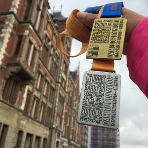 De laatste twee kilometers kom ik weer een beetje in de flow. Ik ben wel kapot, maar ik weet dat die laatste 2 kilometer ook nog moeten kunnen. Het stomme is dat mijn horloge de hele weg al zo’n 400 meter voorloopt. Dat is echt heel irritant! Dat komt omdat de GPS in de IJ-tunnel niet werkt en tjah… dan heb je hier de hele weg last van. Op zich kun je hier rekening mee houden, maar als je zo aan het werken bent op Karakter, dan is dit wel gewoon even ruk. Toch gaan de laatste kilometers best OK. Gaby komt nog langs sprinten, ik zwaai en hoop in mezelf dat ze haar doel bereikt. Er zijn hier weer heel veel mensen aan de kant en dat helpt ook enorm. In het ‘tussenstuk’ is het toch wat minder vol met toeschouwers en dat is dan toch wat ‘saaier’. Ik ga hem gewoon wel uitlopen!